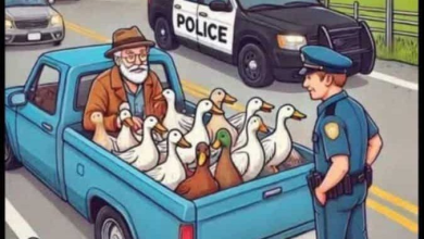 A policeman pulls over an elderly man driving a pickup truck, the bed overflowing with ducks. The officer says sternly,…