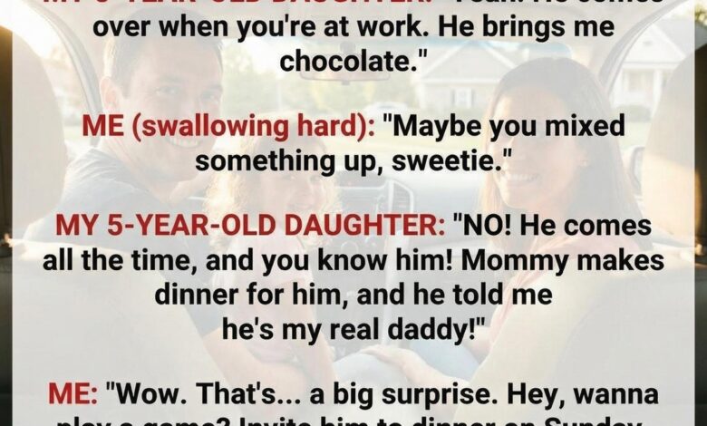 My hands tightened around the steering wheel. I forced a laugh that didn’t reach my chest and asked her what she meant. Lily was five, carefree, swinging her legs against the car seat, completely unaware that the world had just tilted. She explained it simply, as children do. A man came by sometimes when I was at work. He brought her chocolate. He sat with Mommy at the table while they talked. Sometimes Mommy cooked dinner for him. And he told her he was her “real daddy.”