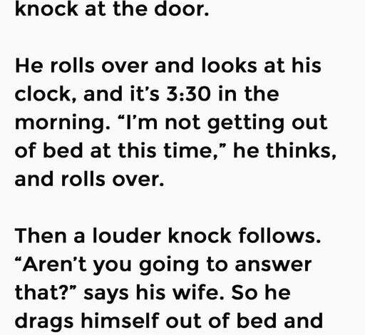 Then a louder knock follows. “Aren’t you going to answer that?” says his wife. So he drags himself out of bed and goes downstairs. He opens the door and there is a man standing on the porch. It didn’t take the homeowner long to realise the man was intoxicated.