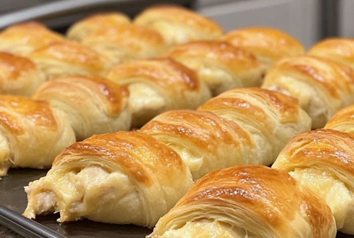 - Fill & Roll: Open the cans of crescent rolls and separate the dough into triangles. Place a heaping tablespoon of the chicken mixture onto the wide end of each crescent triangle. Roll up each triangle, starting from the wide end, and place them on the prepared baking sheet.