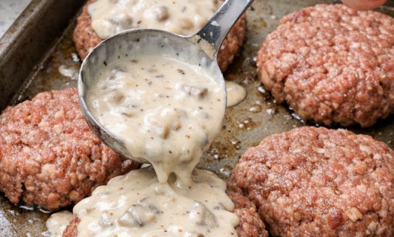 This dish is the definition of simple, stick-to-your-ribs comfort food. Think Salisbury steak stripped down to pantry basics: seasoned ground beef patties baked on a sheet pan and smothered in one creamy, savory mixture made from cream of mushroom soup, milk, and black pepper. It’s practical, budget-friendly, and perfect for nights when you want real comfort without fuss.
