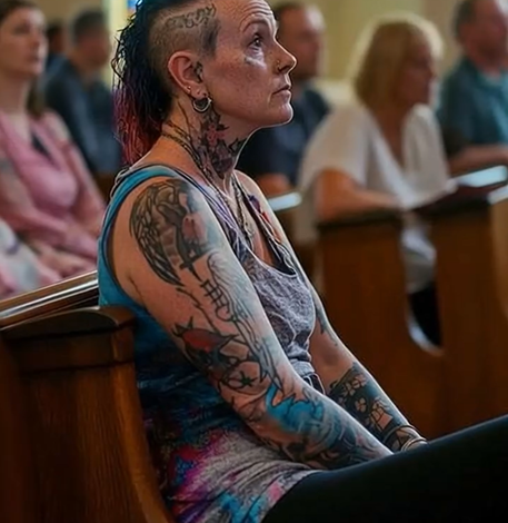 A woman, appearing to be in her forties, entered the church with her arms, neck, and visible parts of her body adorned with intricate tattoos, accompanied by multiple piercings on her ears, nose, and eyebrows.