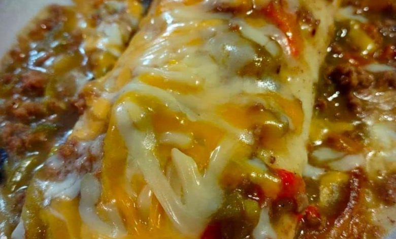 These filling Wet Burritos are loaded with flavorful seasoned ground beef and beans, covered in a rich sauce, topped with melty cheese, and baked until hot and bubbly.