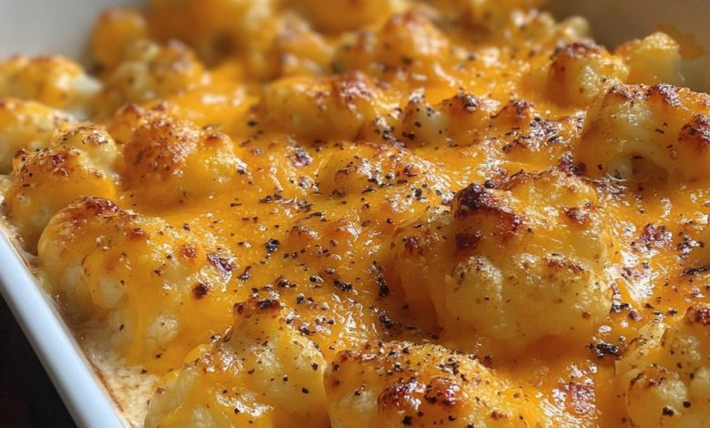 Transfer roasted cauliflower to a baking dish. Pour the cheese sauce over it and gently mix to coat evenly. Bake 15–20 minutes, until bubbly and lightly golden on top.