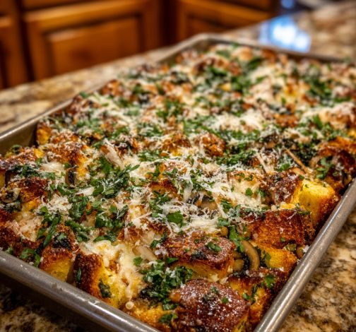 Result: A rustic, cheesy strata with crisp edges, soft layers, and rich savory flavor—perfect for brunch gatherings or cozy family dinners.