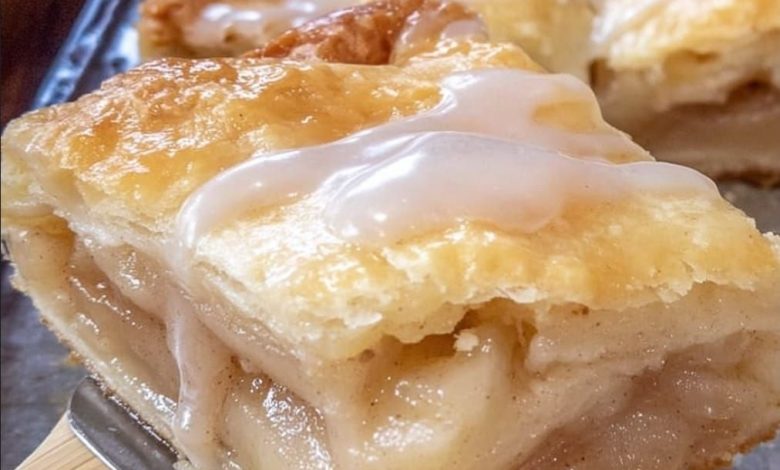- Assemble the Slices: On a lightly floured surface, roll out one portion of the dough into a large rectangle and transfer it to the prepared pan, pressing it into the bottom and up the sides. Pour the apple mixture over the dough and spread it out evenly. Drizzle the melted butter over the apples. Roll out the second portion of dough and carefully place it over the apples. Press the edges to seal and cut a few slits in the top crust.