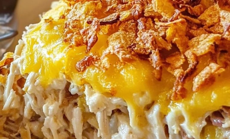 This cozy Crunchy Chicken Casserole is a rich, simple comfort dish made with tender shredded chicken, mixed veggies, and a creamy base, all finished with a buttery, crisp topping made from cornflakes or fried onions.