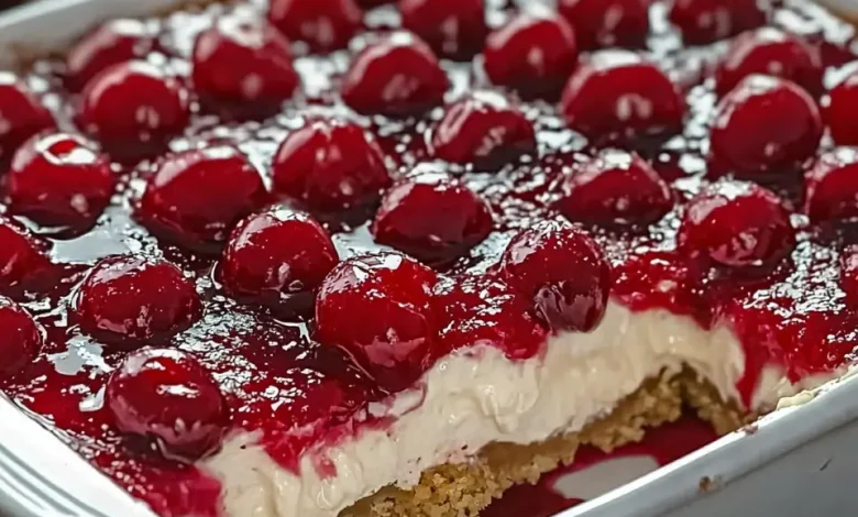 This no-bake dessert features a buttery graham cracker crust topped with a light, creamy cream cheese and Cool Whip filling, finished with a bright layer of cherry pie filling.
