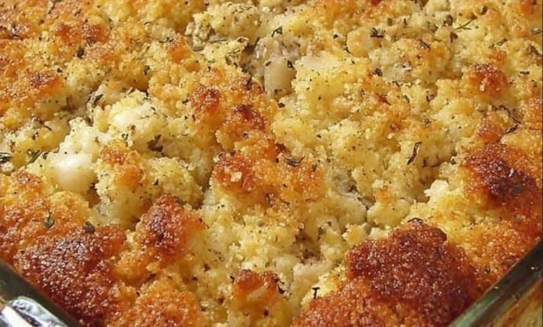A classic, savory dressing that combines crumbled cornbread and dry bread crumbs with sautéed vegetables, eggs, broth, and plenty of poultry seasoning and sage.