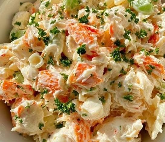 This simple and quick seafood salad combines shredded imitation crab with a creamy dressing, crisp vegetables, and a touch of fresh lemon and dill for extra flavor.