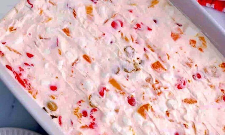 Mix in the drained fruit cocktail, halved cherries, and mini marshmallows until evenly coated.