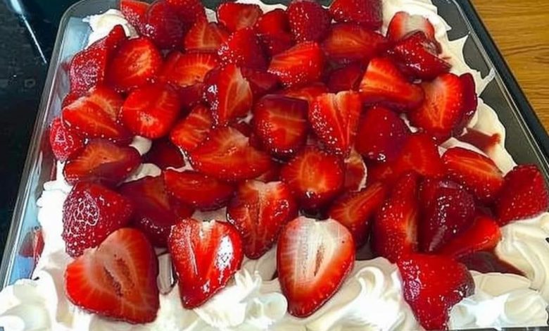- Spread the remaining half of the whipped topping over the strawberries, creating a smooth surface.