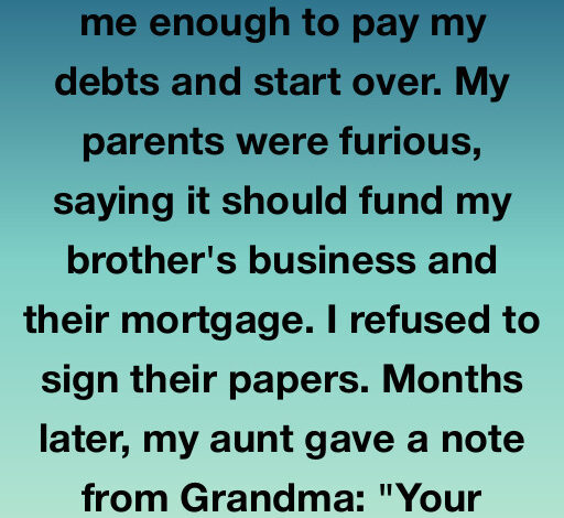 I read my grandmother’s note about fifty times the night my aunt handed it to me. The handwriting shook, but the words were sharp: “Your parents will try to take this from you. Don’t let them. You’ve always been the one who needed a chance. Take it.” It felt like a warm blanket and a slap at once. I cried like a kid on the twin bed in the apartment I could finally afford.