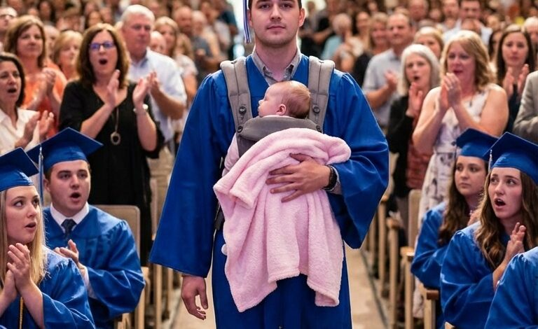 My instincts took over. I reached into the carrier and placed the tiny, sleeping infant into his arms. He tucked her securely against his chest, her small face barely visible beneath the heavy fabric of his graduation gown, wrapped in a soft pink blanket. He turned and began the long walk toward the stage. The reaction was instantaneous. The air in the room curdled as whispers turned into ripples of mocking laughter. “Are you serious?” someone muttered. “How typical,” another snickered. Then, directly behind me, a woman hissed a sentence that felt like a physical blow: “Just like his mother.”