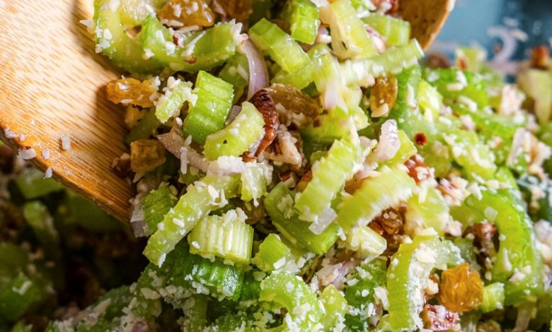 This Woodward Celery Salad is a refreshing and flavorful side dish with a delightful combination of textures and tastes. Crisp celery is tossed with sweet raisins, crunchy pecans, and thinly sliced shallots, all coated in a bright lemon-honey vinaigrette and finished with the salty bite of grated Parmesan cheese.