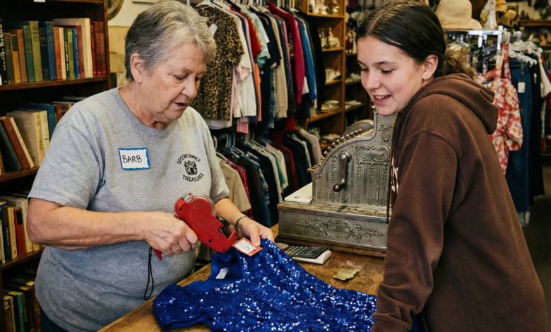 She stood at my counter with a blue sequined dress folded over her arms like it was something alive.