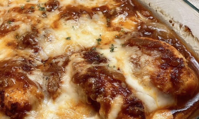 This French Onion Chicken Bake brings the beloved flavors of French onion soup to a hearty chicken casserole. Tender chicken breasts are smothered in rich, jammy caramelized onions and topped with melted mozzarella and Parmesan cheese for a comforting and flavorful meal.