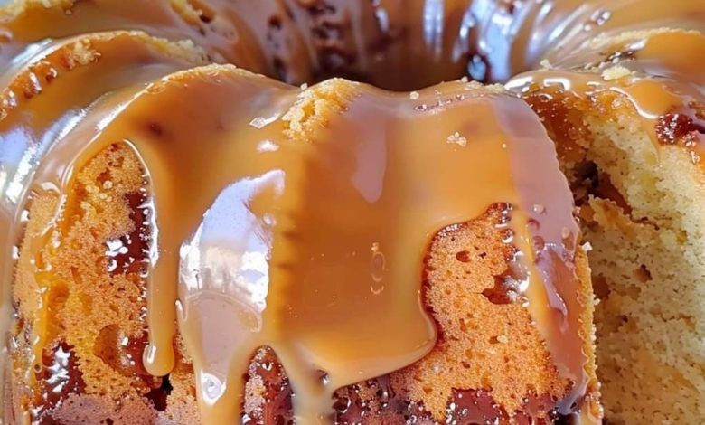 - Drizzle Caramel Over Cake: Once the cake has cooled completely, spoon the prepared caramel drizzle over the top of the cake, allowing it to drip down the sides.