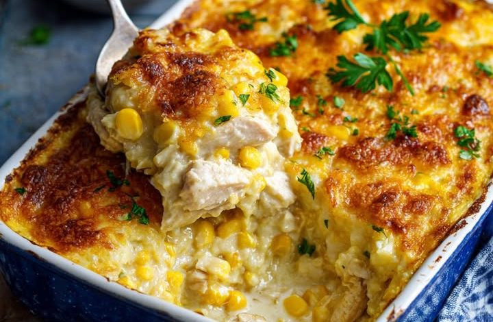 This cozy Oven-Baked Creamy Corn and Chicken Casserole is an easy dish featuring tender shredded chicken and two types of corn, all smothered in a rich, cheesy, flavorful sauce and baked to golden perfection.