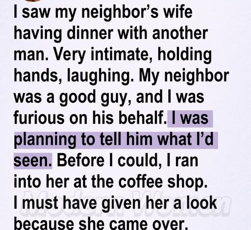 I was halfway through dinner at a small Italian restaurant on Maple Street, the kind of place with dim lights, chipped wooden tables, and the constant scent of garlic and wine hanging in the air. I had just lifted my fork when something in my peripheral vision made me stop. Across the room, in a quiet corner, sat my neighbor’s wife.