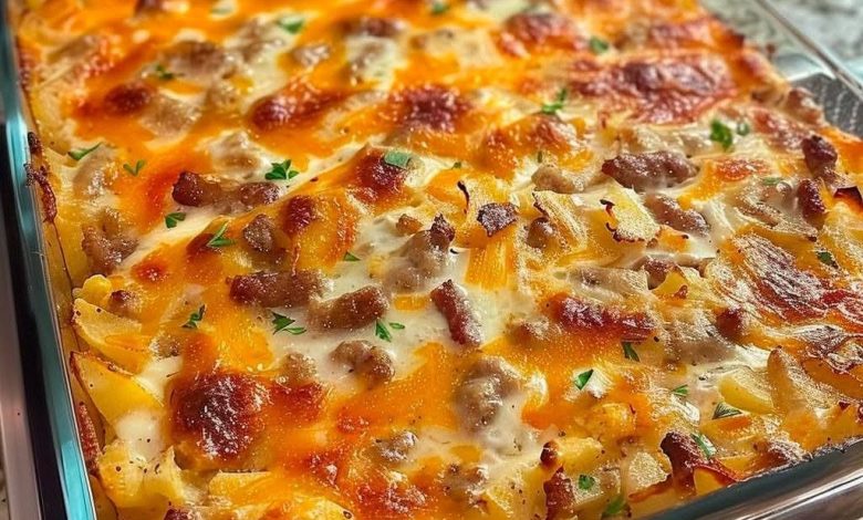 4. Add Cheese and Sausage: Sprinkle the shredded Gouda cheese evenly over the hashbrowns. Then, layer the cooked sausage over the cheese, distributing it evenly across the dish.