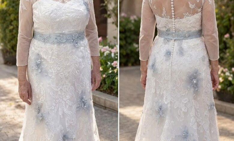 She smoothed her hands over the bodice of her gown. It was a masterpiece of delicate craftsmanship, far removed from the traditional, heavy satin she had worn four decades ago. This dress was a celebration of who she was now—a woman who had lived, loved, lost, and miraculously found love once more. The gown featured a sheer illusion neckline that gracefully gave way to intricate white lace, cascading down her arms in elegant three-quarter sleeves. But it was the subtle details that made it truly hers: soft, dusty blue floral appliqués scattered across the skirt, blooming like hydrangeas in a summer garden. A matching blue sash cinched her waist, fastened with a row of delicate pearl buttons down the sheer lace back. It was her “something blue,” a nod to tradition, yet entirely unique.