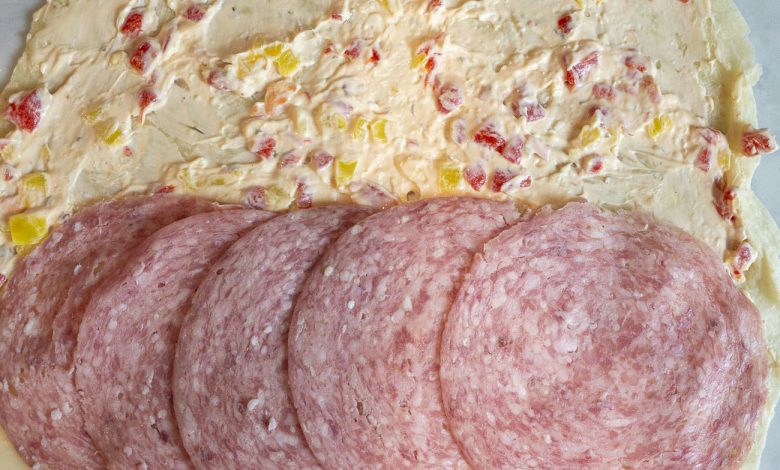 - Layer with Cheese and Meat: At one end of the cream cheese-covered tortilla, arrange slices of provolone cheese in a single layer, covering most of that section. Then, layer the sliced salami or soppressata over the provolone cheese.