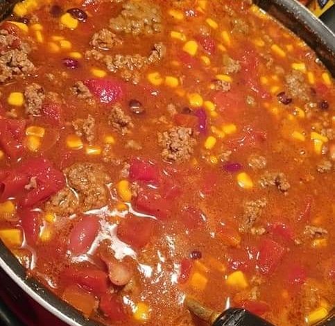 - Combine ingredients in slow cooker: Add ground beef, onion, chili beans, kidney beans, corn, tomato sauce, water, diced tomatoes, green chile peppers, and taco seasoning mix to a slow cooker.
