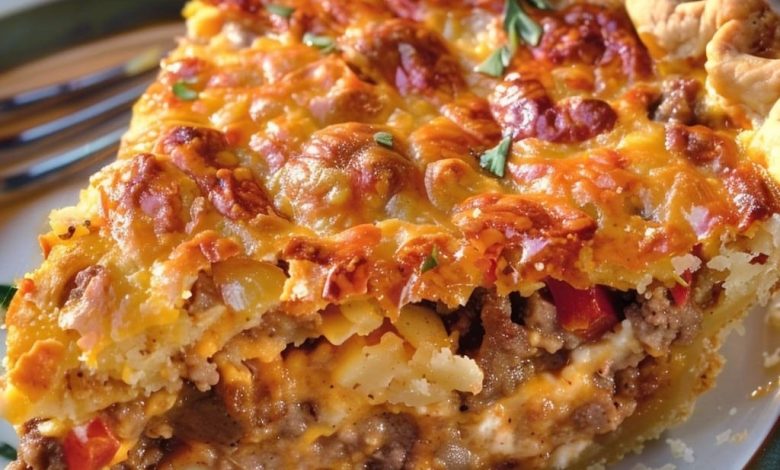 - Assemble the Pie: Spread the cooked sausage in a greased pie dish. Top with the sautéed vegetables and shredded cheeses.