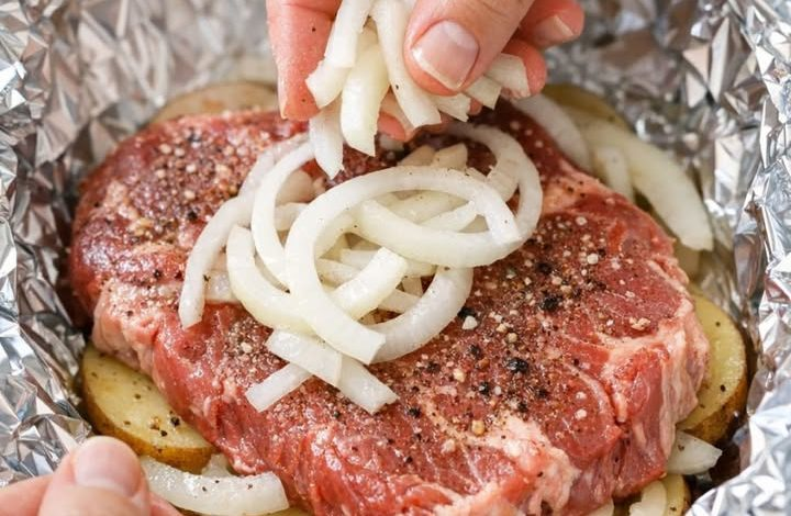 4-Ingredient Beef Steak and Onion Foil Bake