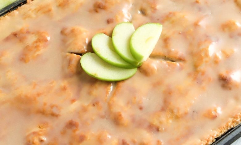 This comforting Mom’s Flat Apple Pie is an easy, sheet-pan version of a traditional double-crust apple pie, featuring sliced Granny Smith apples layered over a bed of Corn Flakes and finished with a thin, sweet frosting.