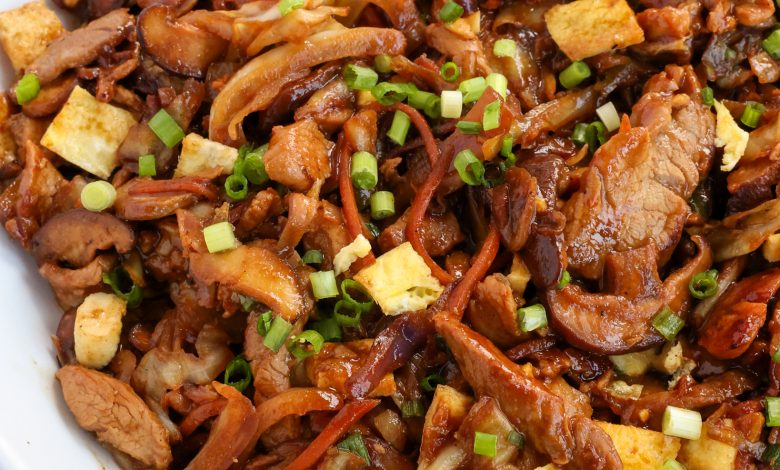 Moo Shu Pork combines thin slices of marinated pork combined with veggies, eggs, and green onions in an easy savory sauce made with Hoisin, garlic, ginger, and black pepper.
