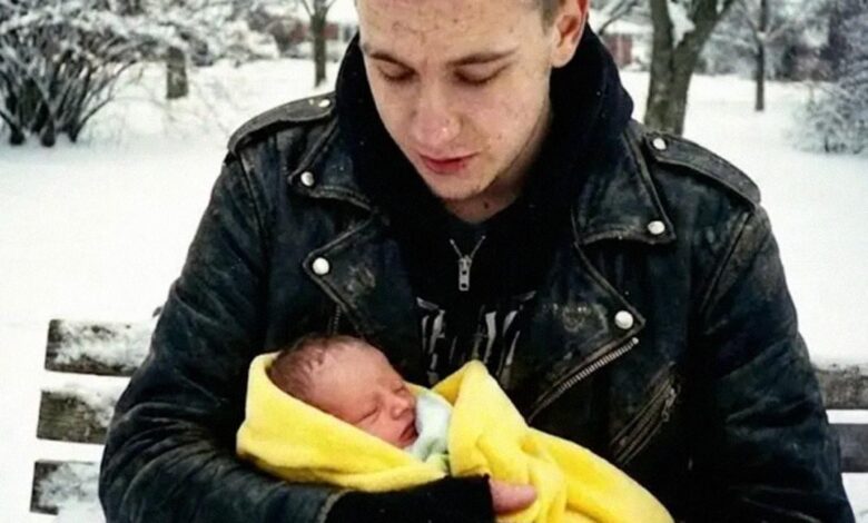 Peering out into the darkness of the park across the street, she saw a shock of pink hair under the orange glow of a streetlight. Jax was sitting cross-legged on a frozen bench, his jacket splayed open and his body hunched over a small, ragged bundle. When his mother tore across the street, feet bare in her shoes and lungs burning from the frost, she found her son in a state of absolute, focused calm. Nestled against his chest was a newborn baby, red-faced and blotchy from the cold, wrapped only in a thin, inadequate sheet. Jax had already called emergency services and was using his own body heat, shielded by his leather jacket, to keep the infant alive. He was shivering violently, dressed only in a T-shirt beneath his coat, his own lips tinged blue, yet he refused to move. He was the only thing standing between the child and a quiet death in the snow.