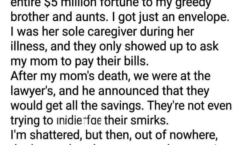 When my mother passed away, I believed I had braced myself for the impact. I thought I was prepared for the hollow ache of grief, the heavy silence that settles into a house once the matriarch’s voice is gone, and the bureaucratic coldness of settling an estate. What I was not prepared for was the final, stinging revelation at the reading of the will. My brother, who had spent most of his adult life living on our mother’s dime and visiting only when he needed a loan, sat across from me in the lawyer’s office, eyes gleaming with anticipation. When the numbers were read, they were staggering. He received millions in liquid assets and the family’s lucrative real estate holdings. My aunts walked away with generous trust funds and heirloom jewelry.