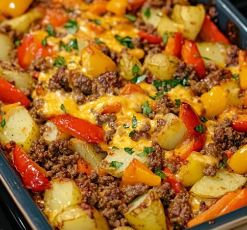 This hearty Oven Baked Southwestern Beef and Pepper Bake is a flavorful and satisfying one-pan meal. It combines seasoned ground beef, tender potatoes, and a colorful mix of bell peppers in a rich, savory sauce, all topped with melted cheddar cheese. It’s a simple, comforting dish that is perfect for a weeknight dinner.