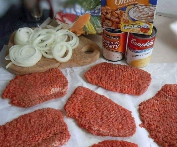 In the slow cooker, place the cube steaks first. Top with sliced onions, cream of chicken soup, cream of celery soup, Lipton Onion Soup Mix, and the water.