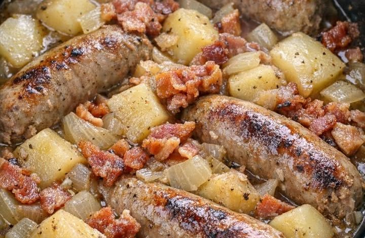In a skillet, cook the sausages until browned on all sides, about 8–10 minutes. In the same pan, cook the chopped bacon until crisp.