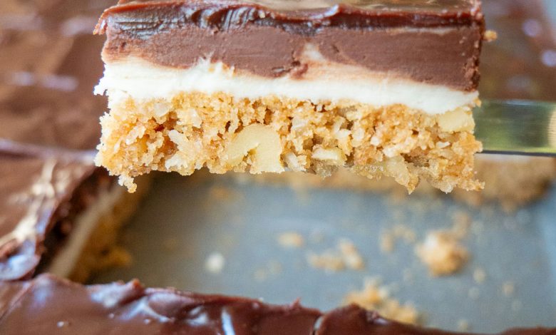 These Heavenly Squares are a rich and indulgent dessert bar with three delicious layers. A dense, graham cracker-based bottom is topped with a sweet, fluffy buttercream frosting and finished with a smooth chocolate topping. They are a perfect treat for a bake sale, potluck, or just a sweet craving.