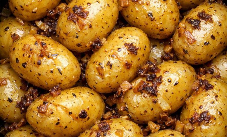 Baby potatoes cook low and slow in buttery onion seasoning until tender, golden, and glossy—those little splits in the skin showing they’re perfectly done. It’s not a traditional regional dish, but a modern Midwestern solution: minimal ingredients, familiar flavors, and a method that fits seamlessly into a busy holiday kitchen.