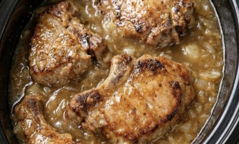 Heat olive oil in a skillet. Sear pork chops 1–2 minutes per side until lightly golden. Transfer to slow cooker. - Layer Apples & Onions