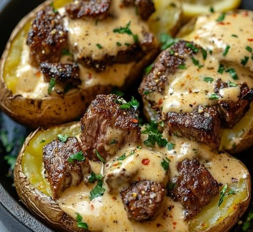 Steak-Stuffed Baked Potatoes with Creamy Parmesan Sauce