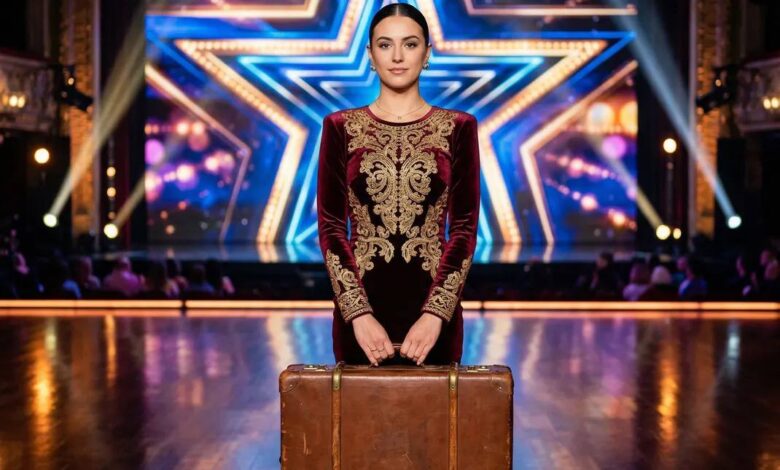 When the performer first stepped onto the talent show stage, the atmosphere felt calm and almost mysterious. Dressed in a striking burgundy velvet outfit with elegant gold embroidery, she stood confidently behind the microphone with a small vintage suitcase placed in front of her. Her composed posture and calm expression suggested she knew exactly what she was about to do, even if the judges and audience did not yet understand what to expect.