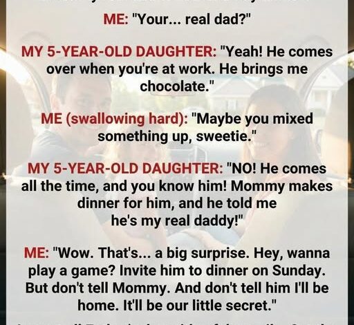 I glanced in the rearview mirror, expecting to see her grinning at a joke. Instead, she looked out the window, her expression serene and matter-of-fact. “I know. But the other one. The one who comes by when you’re at work. He brings the good chocolates, the ones with the gold foil. He sits with Mommy on the sofa. He told me he’s my real daddy.”