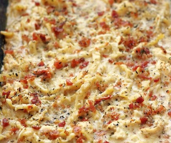 5. Combine Ingredients: In the prepared baking dish, layer the cooked egg noodles, shredded rotisserie chicken, bacon crumbles, and fresh basil. Pour the creamy sauce evenly over the top, ensuring everything is well coated.