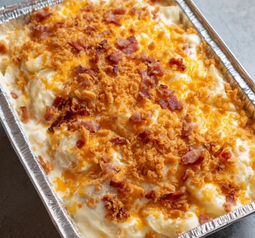 - Layer the Casserole: Layer half of the 6 thinly sliced potatoes in a greased disposable aluminum tray or a baking dish. Sprinkle half of the 6 slices of crumbled bacon over the potato layer. Pour half of the prepared cheese sauce over the potatoes and bacon. Repeat the layers with the remaining potatoes, bacon, and cheese sauce.