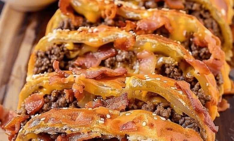 • Layer the Filling: Spread the cooled beef mixture evenly over the dough, leaving a 1-inch border around the edges. Sprinkle the chopped dill pickles over the beef mixture, followed by a layer of American cheese slices.