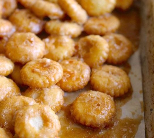 - Coat and Bake: Drizzle the warm caramel over the oyster crackers, ensuring they are evenly coated. Sprinkle with salt.