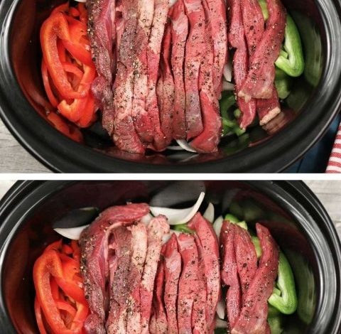 - Prepare the Steak: Sprinkle freshly ground black pepper liberally over the top sirloin steak. Cut the steak into thin strips and place them in the bottom of a 6-quart slow cooker along with the diced onion and bell peppers.