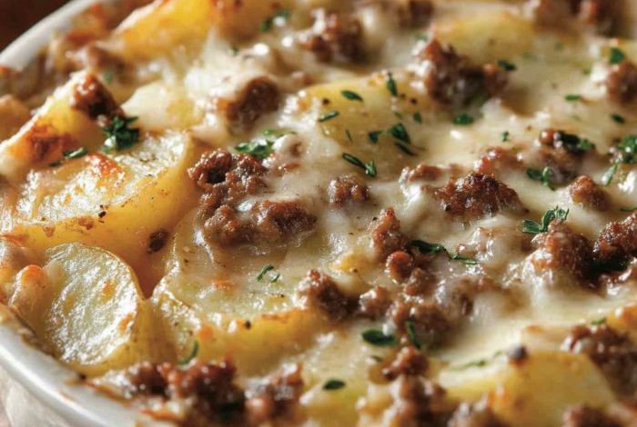 - Layer in baking dish: Grease a baking dish. Place half the sliced potatoes in an even layer at the bottom. Add half of the beef mixture over the potatoes, spreading evenly. Repeat the layers with remaining potatoes and beef.